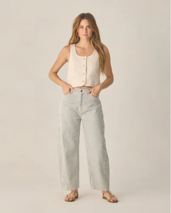 Our Sylvie Vest is classy and coastal. Featuring a rounded square neckline, mango buttons and welt pockets.